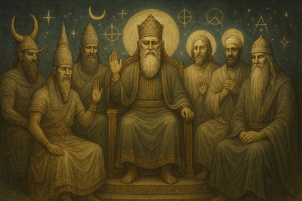 In this interpretation, these are not separate gods but masks of the same imperial force — adapted to different civilisations and epochs.